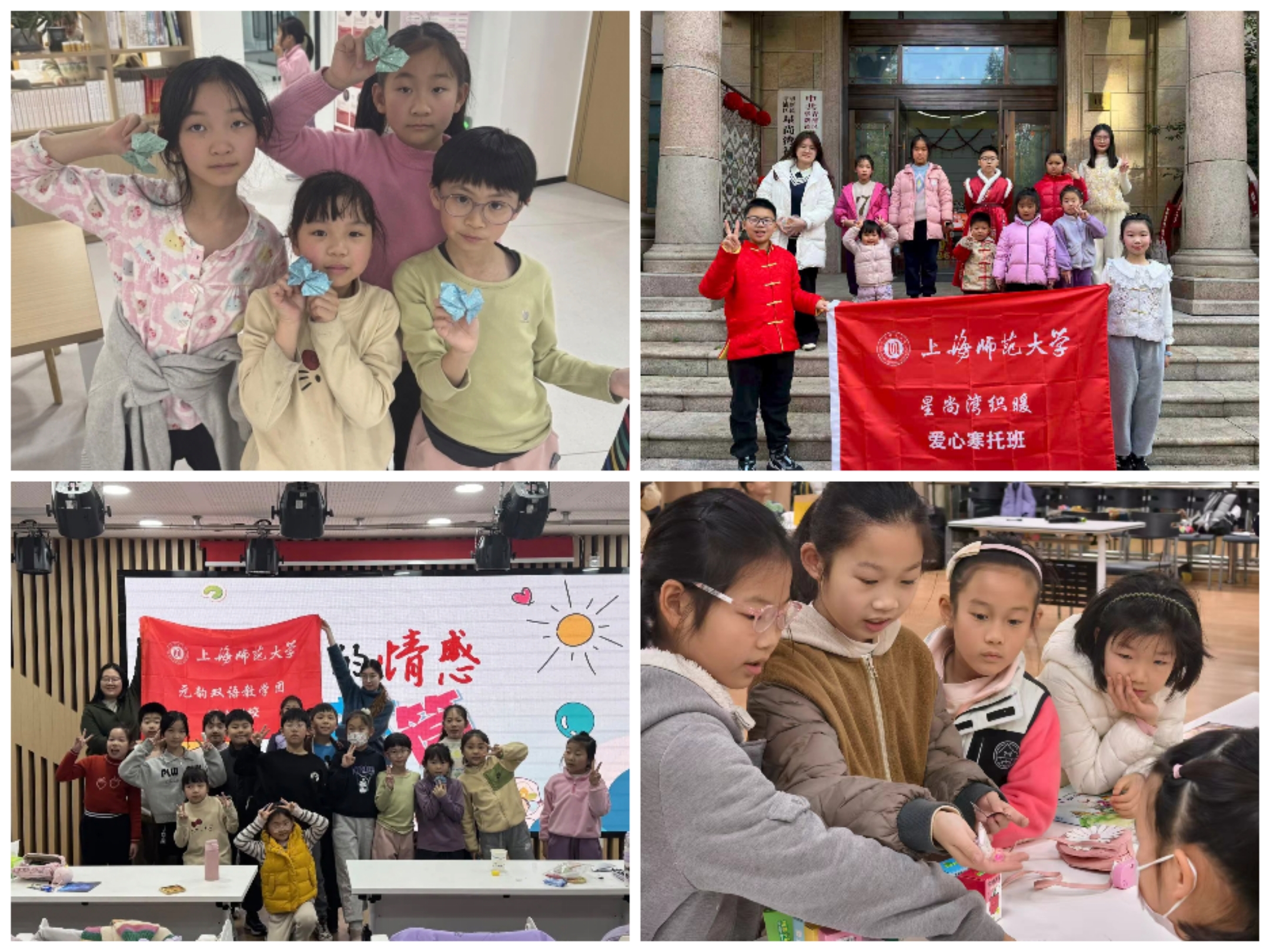 暖心育才守初心,公益教学传温情。学院精心打造3所爱心学校与1所爱心寒托班,近60名学子化身志愿教师,为沪上百余位少年儿童送上特色公益教学服务。平阳绿家园“诗吟童趣”爱心学校以诗词文化为核心,开设汉服手工、考古寻宝等特色课程,让孩子们在动手实践中领略中华文脉的独特魅力;“元声启智-曲韵童心”爱心学校创新融合AI虚拟教师技术,构建德智体美劳全面发展的课程体系,让趣味与知识在课堂中相融;“师雁暖行”爱心学校聚焦医务工作者子女需求,量身定制课业辅导与医疗职业体验课程,为一线医护人员排忧解难;星尚湾织暖爱心寒托班以“双语陪伴与文化启蒙”为特色,通过趣味汉语游戏、英语电影鉴赏等活动播撒求知种子,志愿者们用爱心与专业为孩子们打造了充实又温暖的寒假时光。